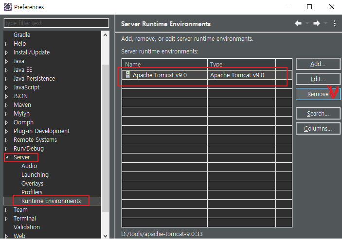 3. 세 번째로는 Preferences에서 Runtime Environments의 설정을 다시 확인하세요. Apache Tomcat v9.0을 선택 - Remove - Add - 설치한 톰캣 버전에 맞추어서 재설정해주세요.