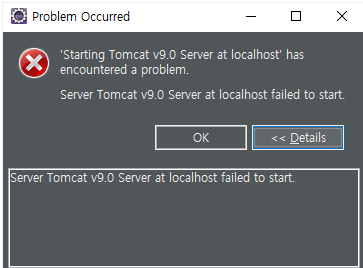 저는 제 workspace에 있던 JSP 파일을 컴파일하려고 Ctrl+F11을 누르니까 이런 문구가 뜨더군요. "Tomcat Server v9.0 Server at localhost failed to start" 이 말 그대로 해석하면 "이 컴퓨터(로컬 호스트)에서 톰캣 9.0 버전의 서버를 시작하는 것에 실패했다"라는 뜻이죠. 일단 제가 알고 있는 한에서 생각해 보았을 때는 3가지 이유가 있었습니다.
