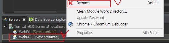 - 두 번째로 서버 경로가 제대로 되어있는지 확인합니다. 아래 사진과 같이 server에서 해당 프로젝트를 서버에서 해제 or 톰캣 서버 자체를 삭제 후 다시 설정해보세요.